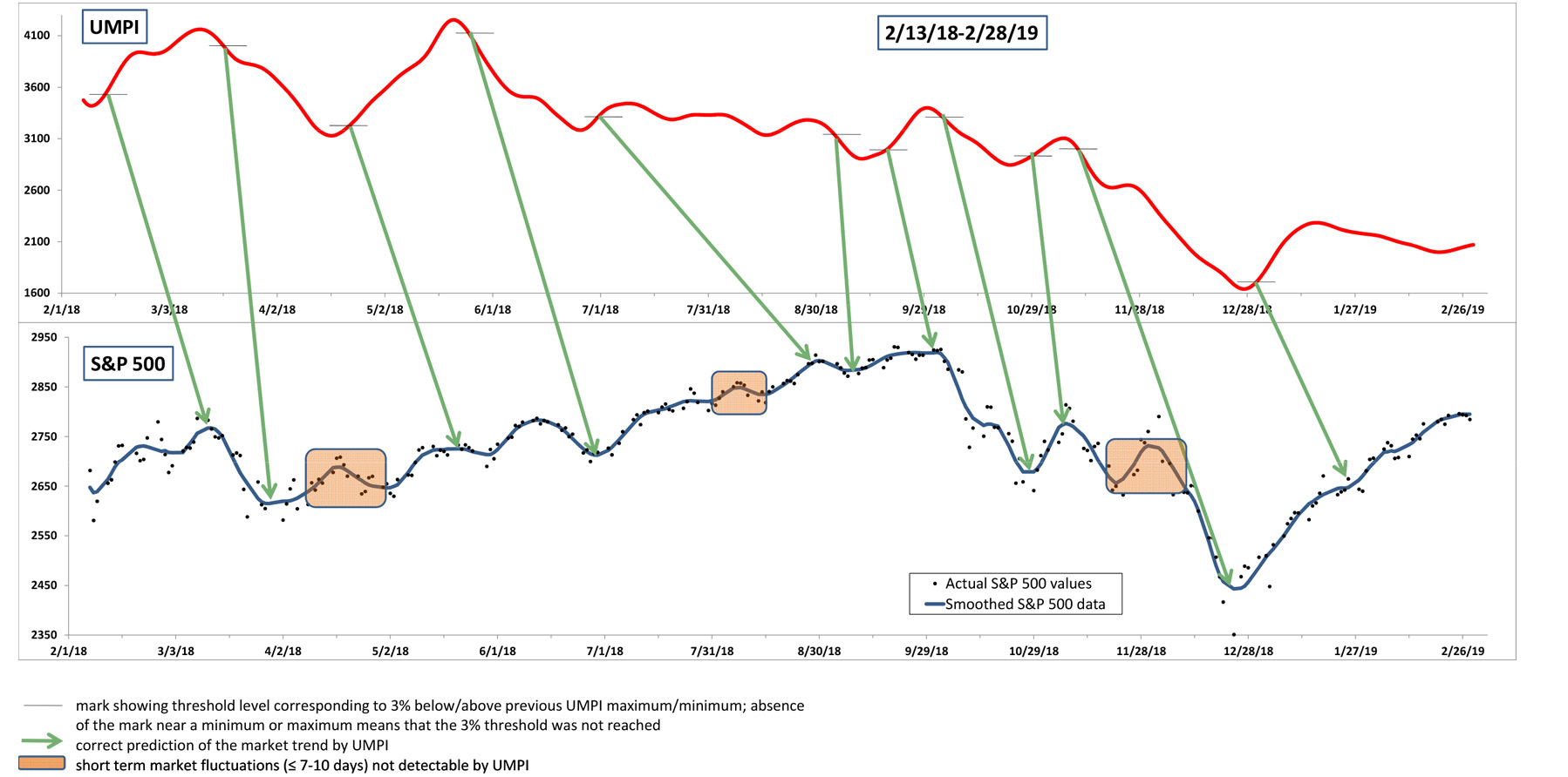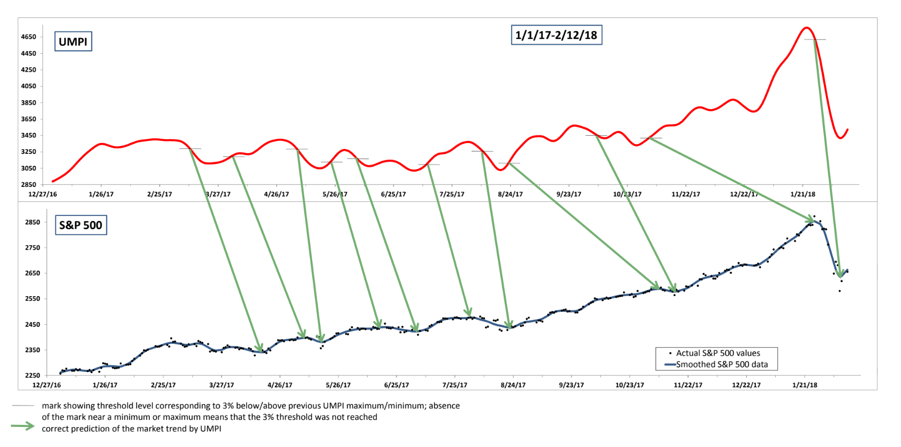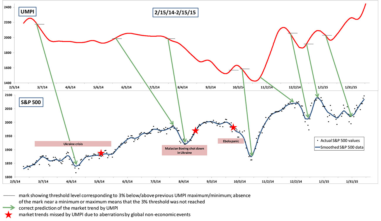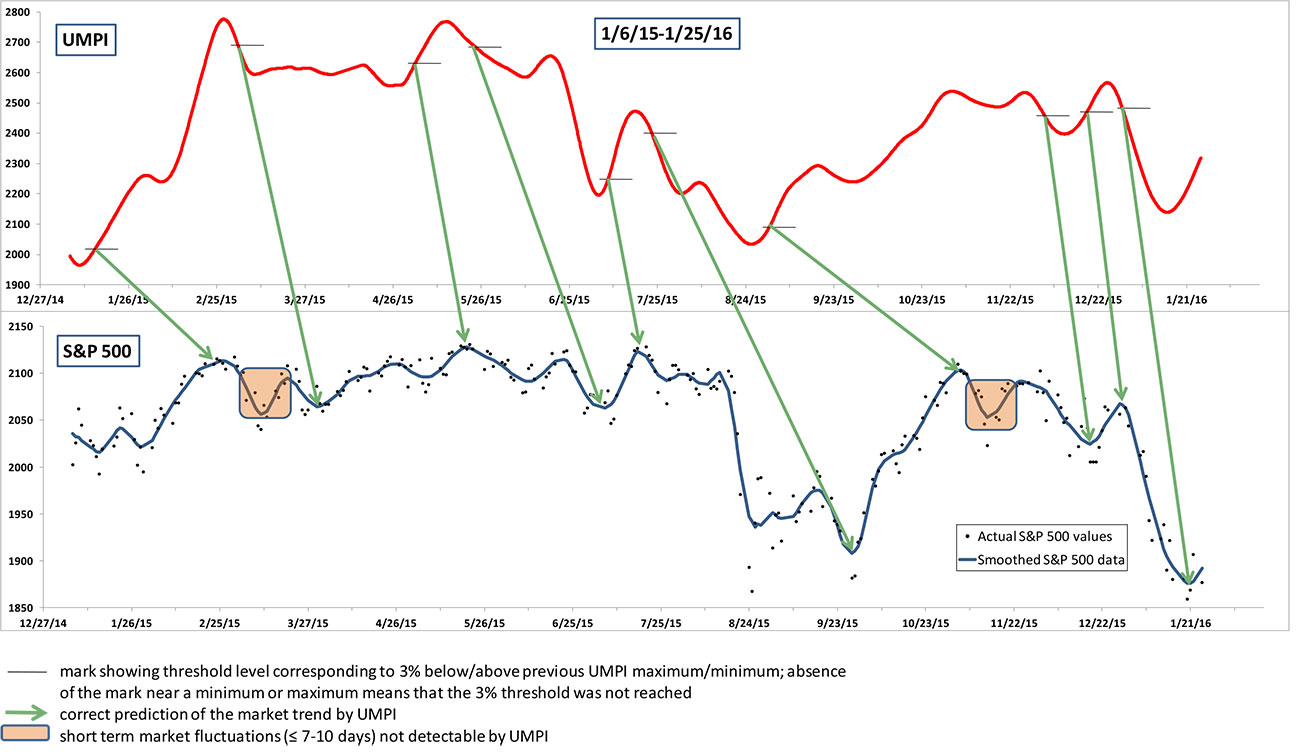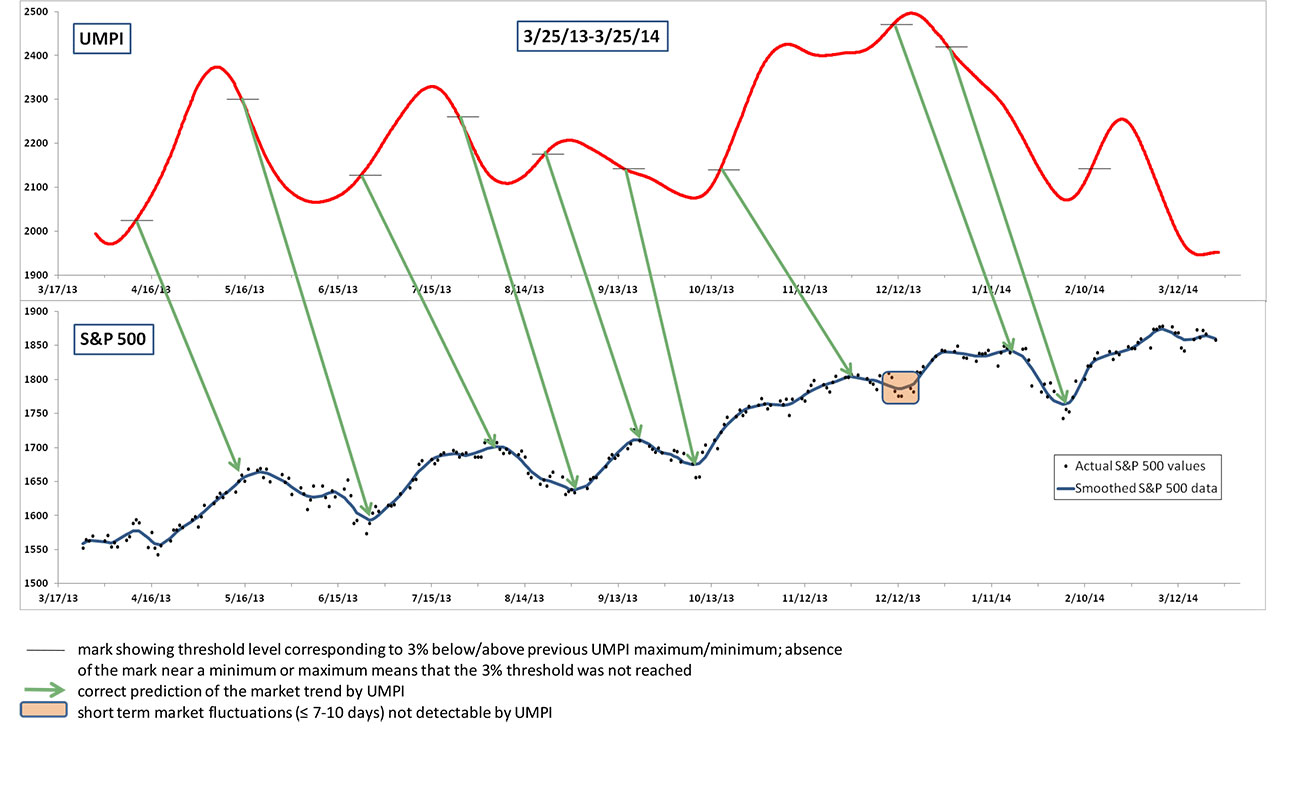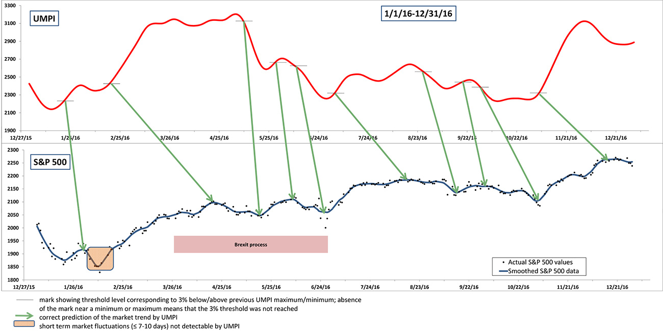 Before offering UMPI as a service to the investor community, we have tested it for several years to confirm its accuracy. The results of our test period are presented in the series of diagrams, which shows UMPI variation over time side by side with historical data for the broad S&P 500 market index. The historical data show that in the vast majority of cases (with a few exceptions discussed in more detail later) UMPI consistently and correctly predicted market moves. Specifically, over the four years of observation (2013-2016) UMPI correctly predicted 34 of 38 occurrences of S&P 500 trend changes, which is an impressive 90% success rate.